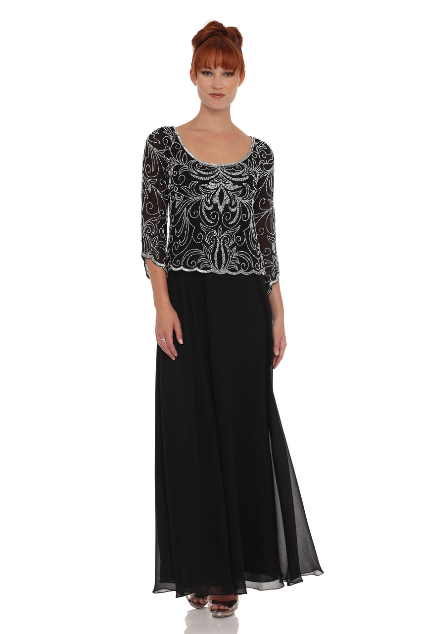 Featuring a gorgeous beaded design and a flattering silhouette emphasizing the two-piece look while a gauzy, ankle-skimming skirt flares.